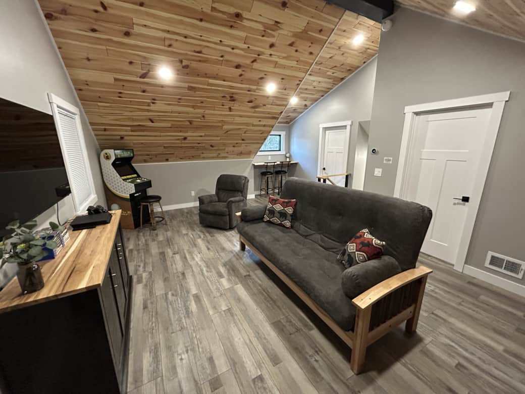 Relax and unwind in the spacious living areas, or enjoy endless entertainment with a pool table, classic video arcade, golden tee video arcade, board games, and a PlayStation 4. In the evenings, gather around the fire pit (wood included) or have a drink at the outdoor bar while grilling on the propane grill.